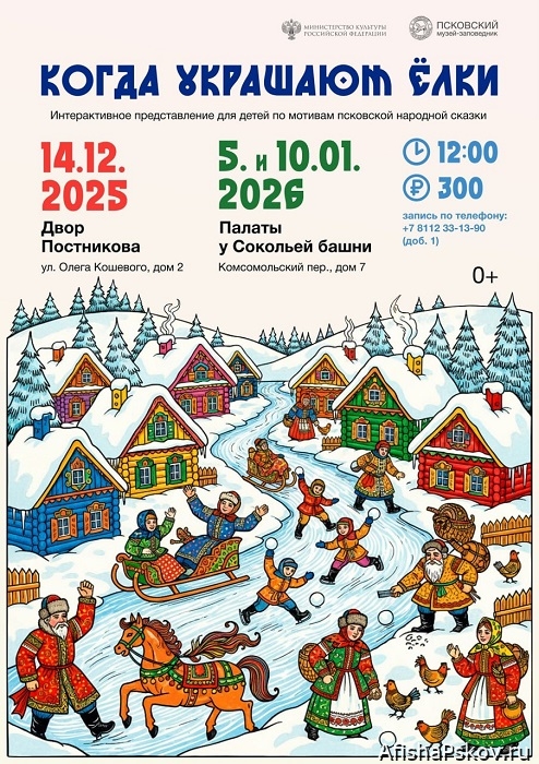 «Под Новый год все вокруг наполняется ожиданием чуда, и наши юные зрители не останутся в стороне. Их ждут увлекательные задания, хороводы с песнями и, конечно же, волшебные сказки. Новогоднее представление станет путешествием в мир псковской народной сказки, где каждый сможет стать частью удивительной истории», — анонс.