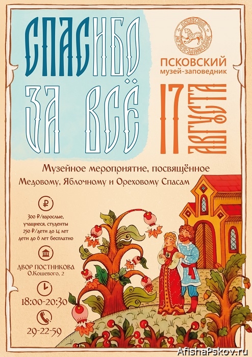 17 августа в музейном комплексе «Двор Постникова» в Пскове традиционно пройдет мероприятие, посвященное трём Спасам августа: Медовому, Яблочному и Ореховому (Хлебному).