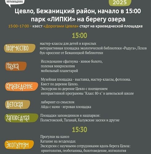 16 августа, в субботу в деревне Цевло Бежаницкого района пройдет фестиваль, посвященный дикой природе и деревенскому укладу — «РосянкаFEST». Площадка фестиваля – это часть старинного усадебного парка, расположенная на высоком берегу одноименного озера – Цевло. Основная тематика праздника – экология, сохранение природы и ответственное отношение к природным ресурсам. Поэтому многие мероприятияЧитать
