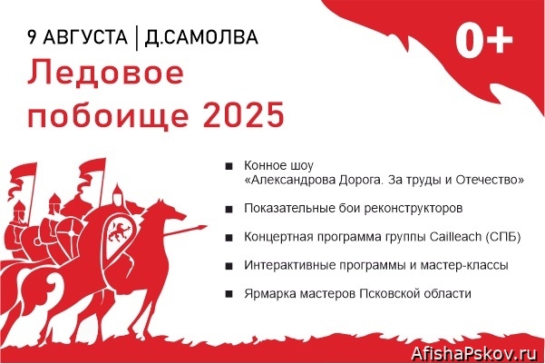 9 августа 2025 (суббота) на территории Мемориального комплекса «Князь Александр Невский с дружиной» в деревне Самолва Гдовского района состоится ежегодный Военно-исторический фестиваль «Ледовое побоище». Традиционно мероприятие пройдет совместно с проектом «Александрова дорога. За труды и Отечество». 0+ В программе: 🔸Конное шоу «Александрова Дорога. За труды и Отечество» 🔸Показательные бои реконструкторовЧитать